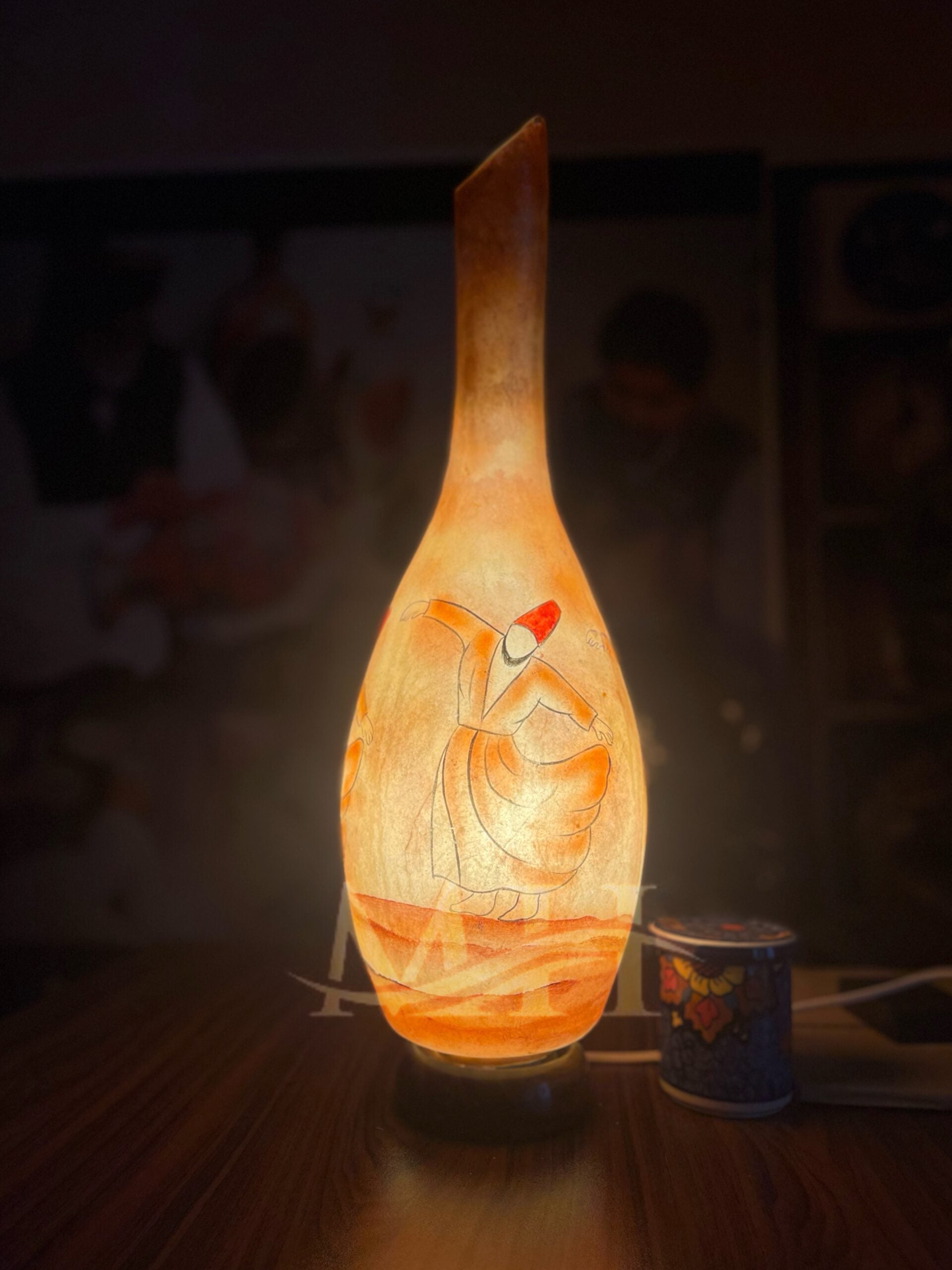 Shaped like a graceful Surahi (a traditional water vessel), this lamp features intricate hand-painted designs on natural camel skin, emitting a soft, warm glow that transforms any room into a serene sanctuary. Each piece is one-of-a-kind, showcasing the artisan's dedication, precision, and artistic flair.