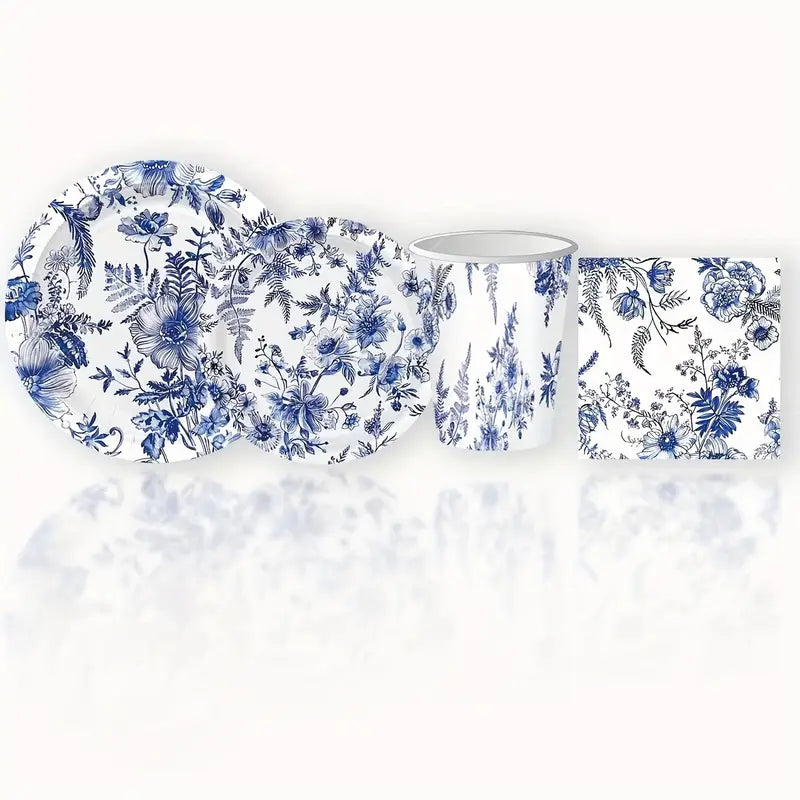 Featuring a delicate blue floral pattern on a crisp white background, the set includes dinner plates, dessert plates, cups, and napkins—everything you need to serve in style without the hassle of cleanup.